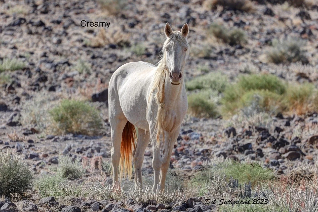 As the band came closer, they stopped for a moment to look at me and as they stood there in the hot summer sun they all looked like cremellos. However, I soon learned that their handsome band stallion Houston was actually a light colored palomino and so were two of his mares Ziva and Vegas. However Vegas’ filly, Casino, was also a cremello. This very light colored band was easy to spot even from far away as they all looked white in contrast against the brown desert hills. I thought Creamy to be one of the most beautiful mares on the range and it has been interesting to follow her band changes over the past few years.
