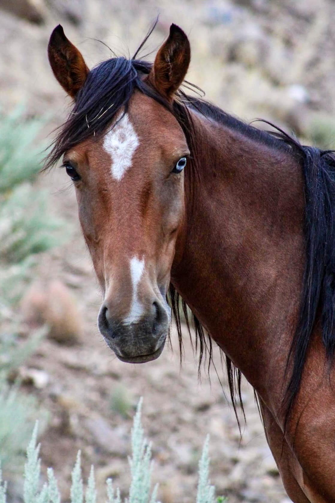 Sometimes, a horse may only have one blue eye. This is another genetic trait called heterochromia, which is a genetic mutation that affects the pigment of only one iris. This normally happens in paints or appaloosas. On our range, we have a handful of horses with this mutation. New Moon (shown below) is a beautiful Virginia Range mare with one blue eye, and no problems with eyesight!